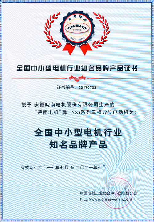 皖南電機(jī)榮獲 “全國中小型電機(jī)行業(yè)知名品牌產(chǎn)品”稱號(hào)